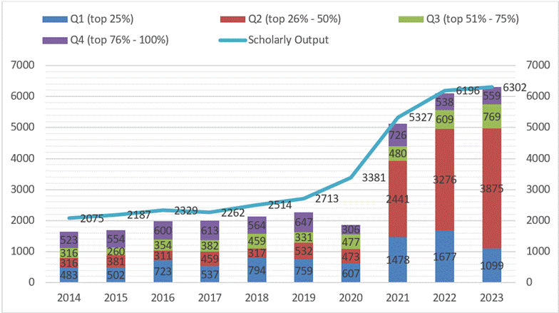 Se analizaron un total de 35 286 investigaciones; con un predominio del año 2023 con 6 302 artículos (17,85 %). Seguido de los años 2022 y 2021 con 6 193 (17,55 %) y 5 327 (15,09 %). El resto de los años presento artículos inferiores a los 3 500 trabajos. El promedio de citas fue de 6,5 por artículos, destacando el año 2014 con el mayor promedio de citas (10,2). Predominaron los artículos publicados en el Q2 con 12 381 trabajos para un 35,08 %. Seguidos de los artículos en el Q1 (8 659; 24,53 %). Destaco el años 2023 con 6 302 artículos en revistas de alto impacto; seguido del año 2022 y 2021 (figura 1).