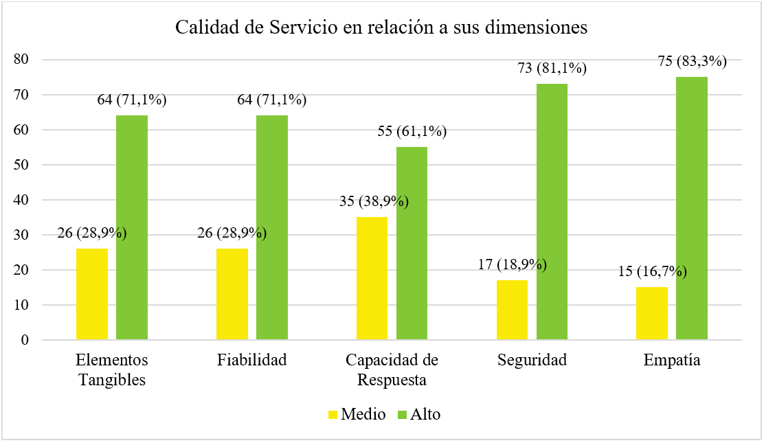 Se representaron los datos luego de dimensionar la primera variable, obteniendo en la dimensión Elementos Tangibles, 26 (28,9 %) con un nivel de percepción medio y 64 (71,1 %) un nivel bueno; para la Fiabilidad, 26 (28,9 %) de los encuestados mostraron un nivel medio de percepción, mientras que 64 (71,1 %) un nivel de percepción bueno; las cifras de la dimensión Capacidad de Respuesta, 35 (38,9 %) tuvieron una percepción media y 55 (61,1 %) indicaron una percepción buena; en Seguridad, 17 (18,9 %) usuarios registraron un nivel de percepción medio y 73 (81,1 %) perciben un nivel bueno; finalmente, para Empatía, 15 (16,7 %) de los encuestados indicaron un nivel de percepción medio, mientras que 75 (83,3 %) perciben como bueno el nivel para esta dimensión.