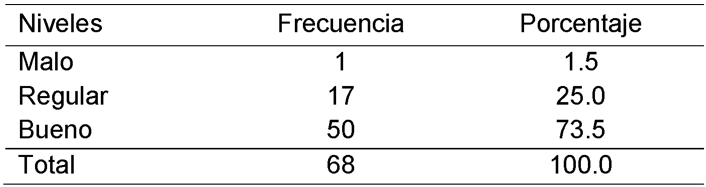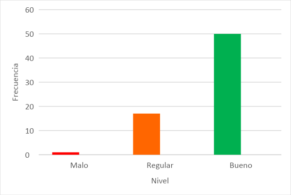 Por otro lado, la dimensión “Trabajo en equipo” presenta un nivel bueno ya que el 72,1 % de los encuestados así lo confirma, así también el 26,5 % percibe que esta dimensión está en un nivel regular y el 1,5 % lo percibe como malo. De lo anterior se puede inferir que en general esta dimensión está en un nivel positivo, ya que 98,6 % de los encuestados perciben que en la entidad de estudio hay un trabajo en equipo óptimo, ya que es de regular a buena. Ahora esto principalmente se debe a que la mayoría de los colaboradores tienen un objetivo en común y la estructura ejercida por la cadena de mando aporta en gran manera un trabajo cooperativo.