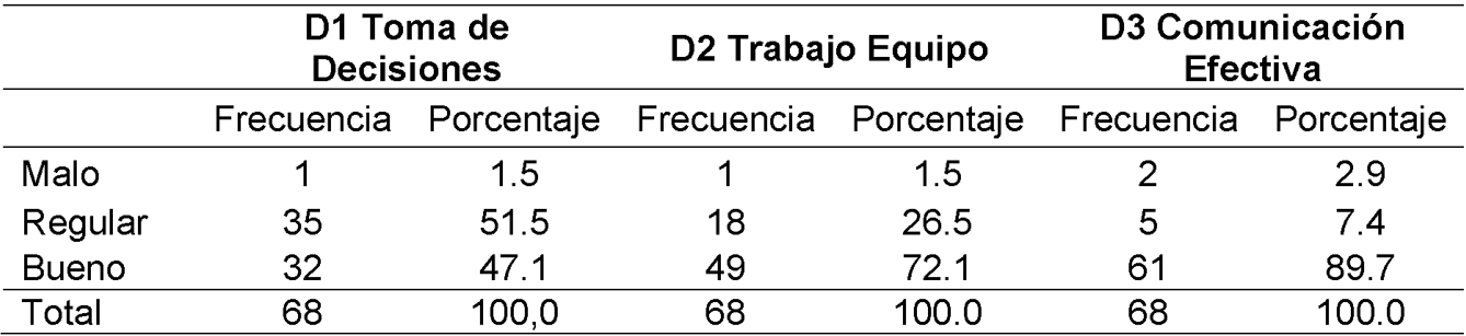 Es importante observar que aquella dimensión con mayor nivel es la “Comunicación efectiva” y aquella que no, es la “Toma de decisiones”. Por tanto, se debe trabajar en esta última para que el Liderazgo en el área de estudio sea democrática.