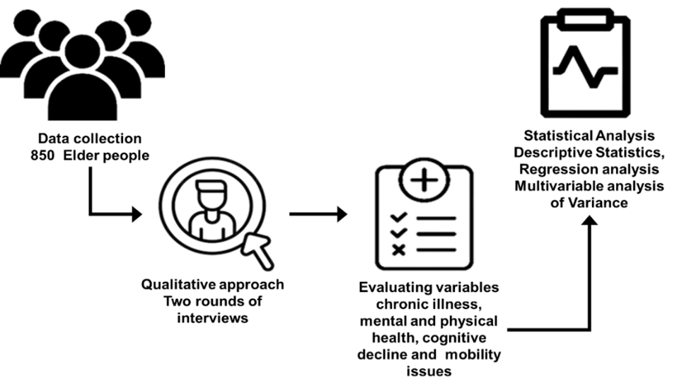 The examination has been employed in the evaluation to assess the health related to influencing elder people’s QoL, including the information gathering and selection process using interviews. Discovering patterns and relationships between health problems and QoL outcomes in a large population is made achievable by statistical techniques, which analyse connections among characteristics at a particular point in the period. Figure 1 illustrates the overall flow of the examination.