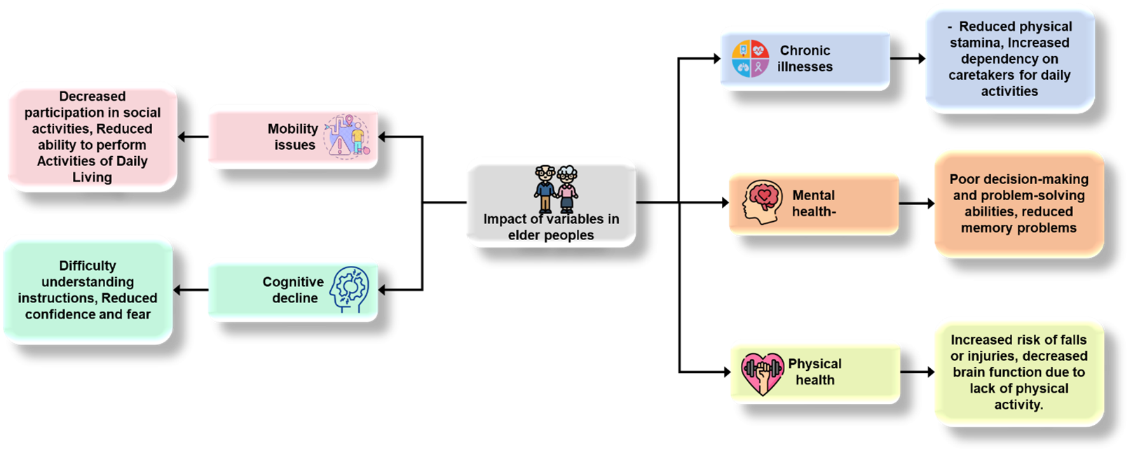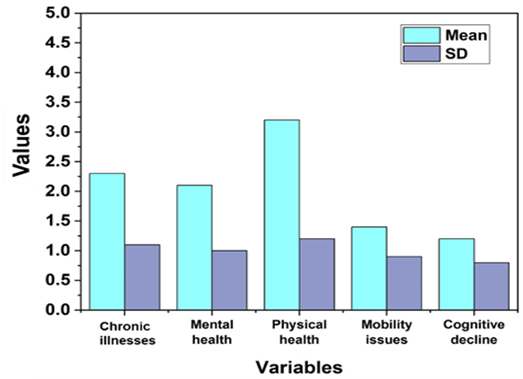 The significant relationships between health factors and QoL in elder people had been demonstrated by the descriptive statistics. With the mean values and modest skewness and kurtosis values, descriptive framework findings guaranteed the variation across problems with mobility, mental wellness, one’s physical well-being, long-term conditions, and cognitive impairment, indicating an essentially standardized distribution. Physical health was the greatest positive predictor of QoL regarding multiple regression analysis outcomes, although issues with mobility and cognitive decline have been linked to significant negative effects. Persistent medical issues and emotional wellbeing also negatively impacted the level of living, but to a lesser extent. All health variables strongly contributed to QoL variation, founded on the solutions obtained from MANOVA, with the most significant impacts being shown in physical health and cognitive decline. The complicated interconnections across parameters have been emphasized by the effects of interaction.