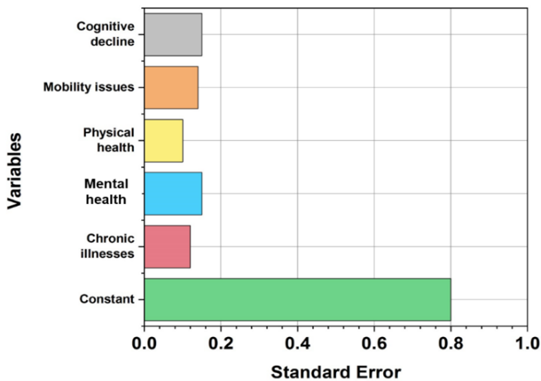 Physical health has reinforced its substantial impact on the dependent variables, as demonstrated by the highest t-value of 6,500. The superior p-statistics (0,008) suggests that chronic illnesses are the least statistically important of the indicators, even if every other variable has significance (p < 0,05). The greatest absolute β value of -0,32, physical health proved the stronger effects. The constant had a 4,50 (B), showing its noteworthy contributions to the regression framework as an ensemble. The lower level of inaccuracies is achieved by the SE (0,15) cognitive decline factor, which is effective for the error-free analysis. Table 4 determines the MANOVA examination for the medical variables that significantly impact QoL across the various dimensions. Figure 4 represents the standard error visualization of every variable in regression analysis.