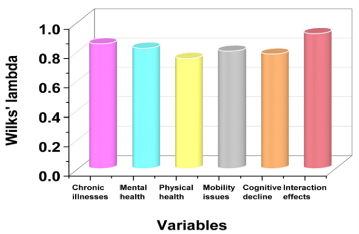 The f-measurement of 12,32 for chronic diseases indicates a substantial correlation between the dependent variable under investigation and chronic illnesses. Wilks’ lambda for chronic illnesses is 0,85. DF1 = 4 indicates that all the variables are being compared in the part of the model. Every variable has a very strong significant association, as indicated by the p-value of less than 0,001. Figure 5 demonstrates the visual representation of Wilks’ lambda of each variable.