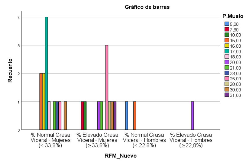Por otro lado, la correlación entre el pliegue del muslo y el porcentaje de grasa estimado por el RFM tampoco evidenció una asociación significativa (tabla 2). El coeficiente de Pearson fue r = -0,080 (valor p = 0,699), mientras que el coeficiente de Spearman arrojó un valor de r = 0,050(valor p = 0,809). Estos resultados indican que el pliegue del muslo, al igual que el pliegue tricipital, no constituye un predictor fiable del porcentaje de grasa corporal en la población estudiada.