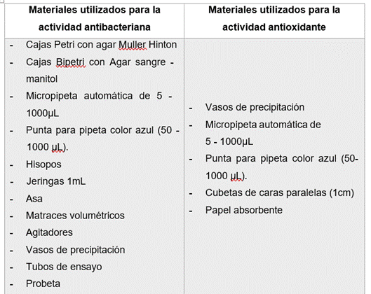 Tabla 4. Muestra: actividad antibacteriana y antioxidante |