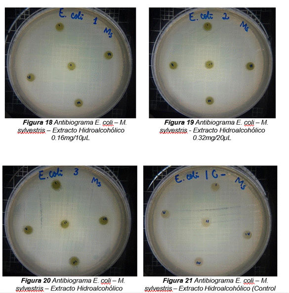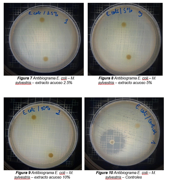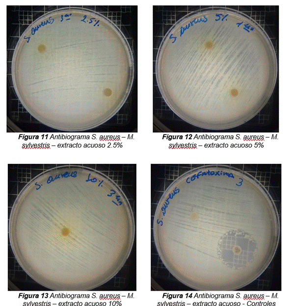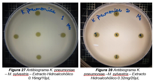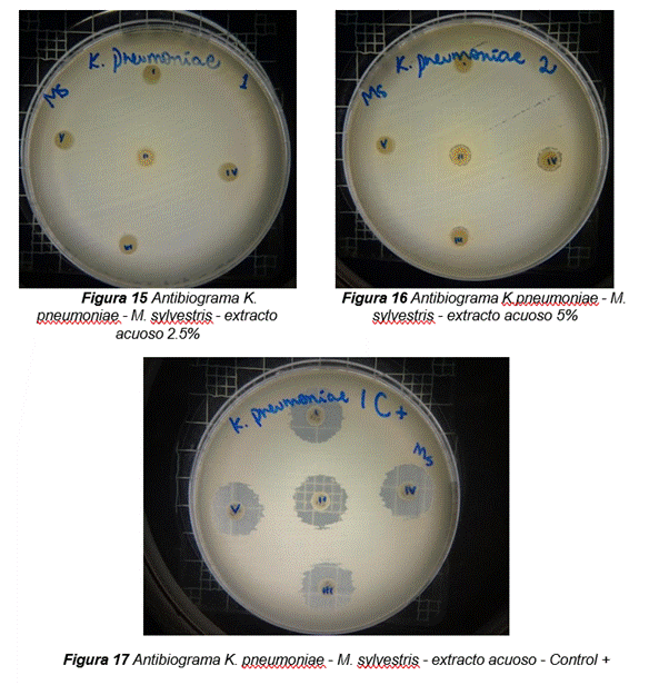 De los resultados obtenidos en cuanto la evaluación in vitro de los extractos acuosos e hidroalcohólicos sobre los microorganismos se pudo definir que solo presentó actividad los extractos acuosos de Malva sylvestris a la concentración de 10 % que presentó un halo de inhibición de 8 mm frente a Klebsiella pneumoniae. Por otra parte, los extractos hidroalcohólicos de M. sylvestris a las concentraciones (0,16mg/10µL – 0,32mg/20µL y 0,48mg/30µL) presentó moderada inhibición la concentración 0,48mg/30µL con un halo de 7 mm frente a
