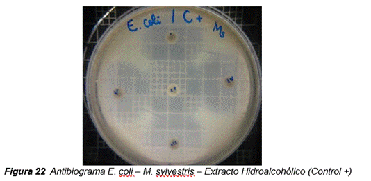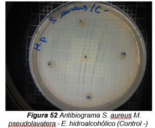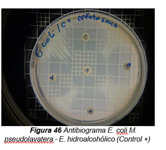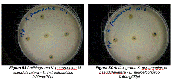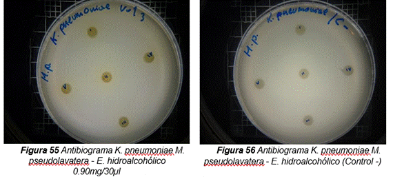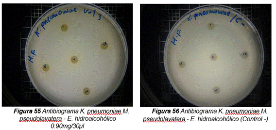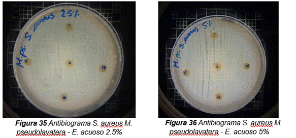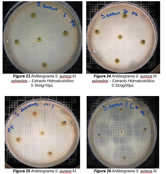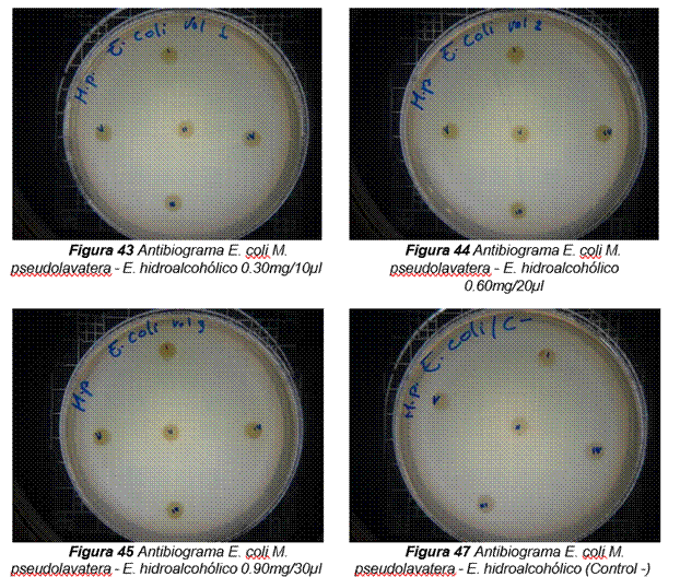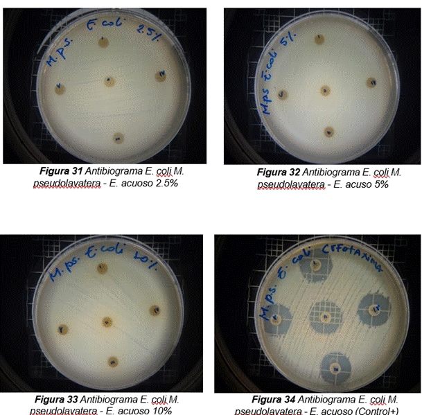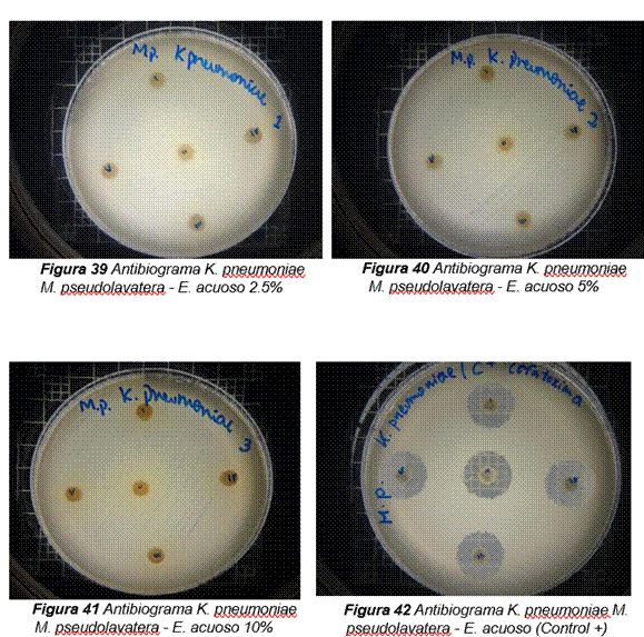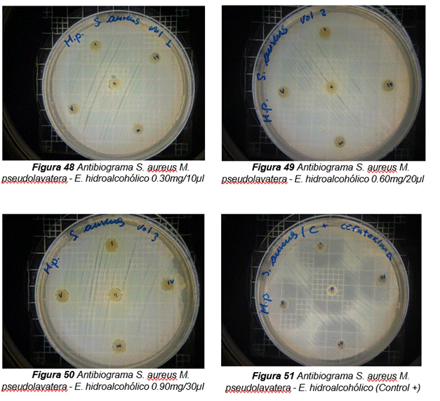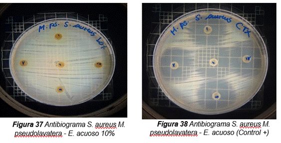 E. coli y K. pneumoniae y los extractos hidroalcohólicos de M. pseudolavatera (0,30 mg/10µL – 0,60 mg/20µL y 0,90 mg/30uL), se observó que presentaron moderada inhibición a la concentración de 0,90 mg/30µL frente a S. aureus, según lo indica el Dr. Jorge Alonso en el taller de plantas medicinales “técnicas de comprobación de acción terapéutica”.