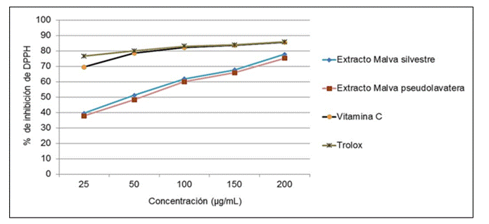 De acuerdo a lo anteriormente mencionado, cabe indicar que la evaluación de la actividad antioxidante de los extractos hidroalcohólicos de Malva sylvestris y Malva pseudolavatera evaluados, mantuvieron un comportamiento similar en este estudio, ya que según los resultados de los tres métodos in vitro realizados, se pudo comprobar que a medida que aumentaba la concentración de los extractos ensayados, la capacidad reductora incrementaba (FRAP) y la actividad antirradicalaria (DPPH y ABTS•+) también, manifestándose de esta manera, una elevada actividad antioxidante.(62,63)